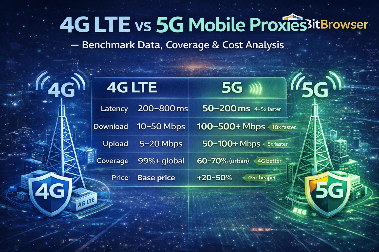 Compare 4G vs 5G mobile proxies in speed, latency, coverage, and cost. Discover real-world benchmarks and find the best option for your use case.